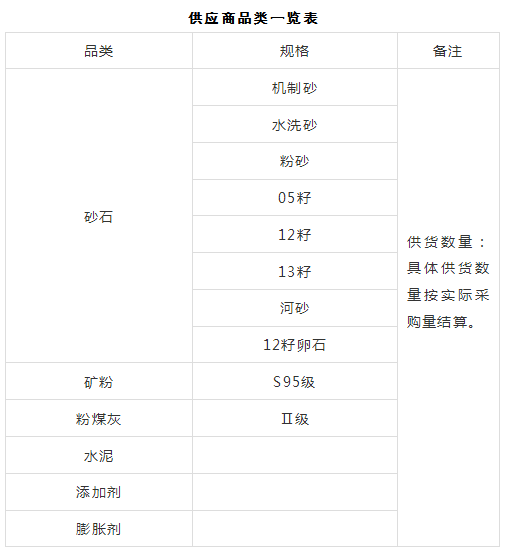 本次征集活動為2025年度第一次原材料供應商的征集,征集供應商品類為:砂石、水泥、粉煤灰、礦粉、膨脹劑、減水劑、外加劑等,現每年總需求約200萬噸。